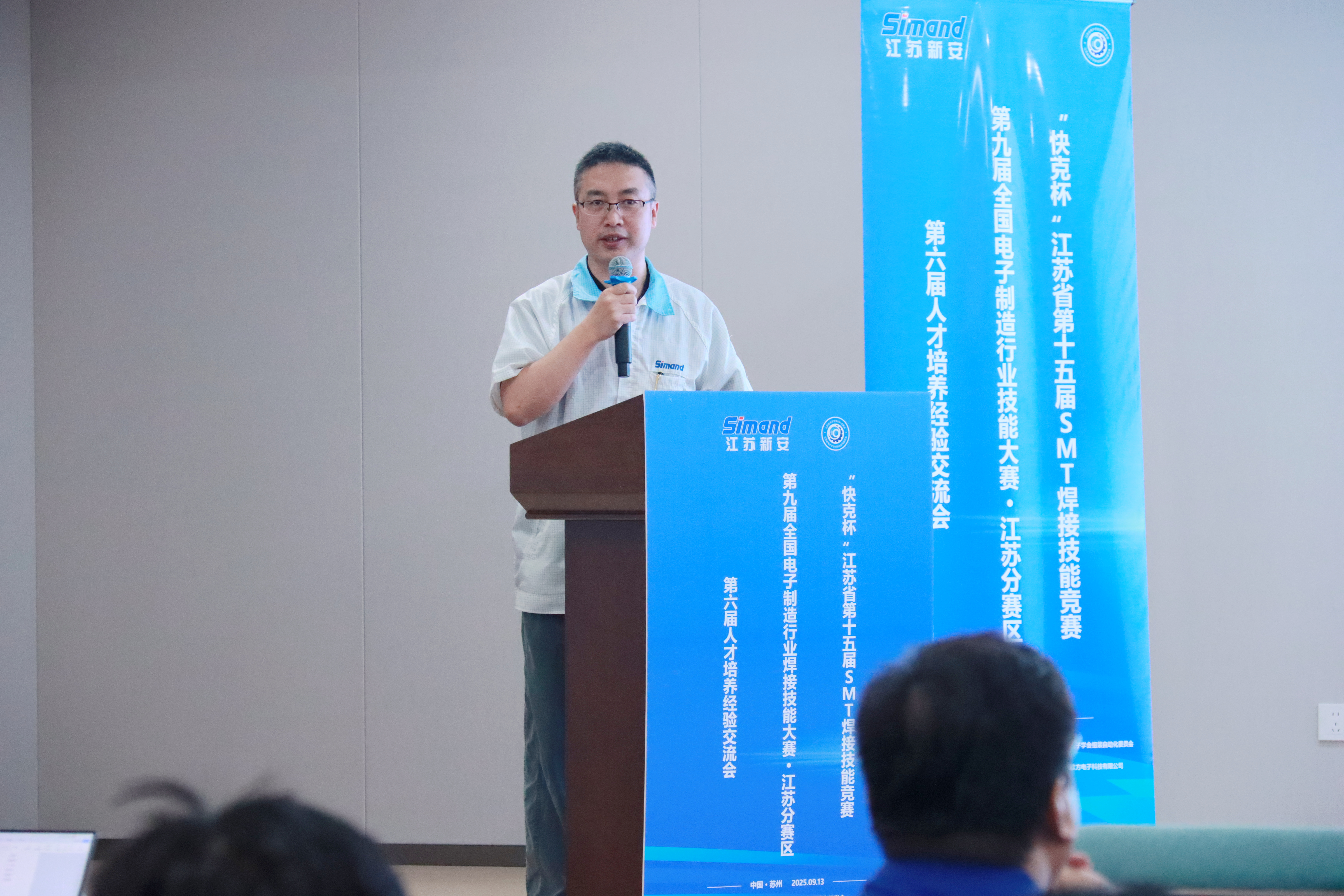 比赛过后,第六届人才培养经验交流会同步召开。来自宝运莱·(中国区)最新官方网站的陈春年、苏州欧方电子科技有限公司的总经理王金伟、苏州优诺电子材料科技有限公司的技术总监陈钦、快克智能装备股份有限公司的总监石宝山,以及2019年江苏省焊接竞赛一等奖、全国五一劳动奖章获得者皮欠红围绕《DFM可制造性设计》《优化工装设计减少焊接不良》《高性能低温无压烧结银》《高可靠性焊接&3D AOI检测的创新应用》《以匠心“焊”守初心》等热点议题展开深度分享。